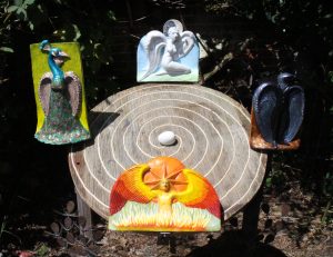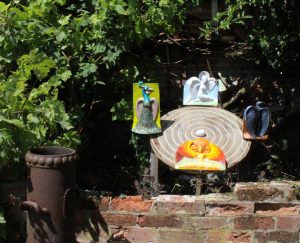 Four iconic birds – swan, peacock, phoenix, and raven – are placed on a labyrinth (mirroring the large labyrinth in the next garden) and centred on the Philosopher’s Egg. The birds relate to the four seasons (winter, spring, summer and autumn), compass directions (north, west, south and east), and the humours (phlegmatic, sanguine, choleric and melancholic). They also represent the four elements, Water, Air, Fire, and Earth.